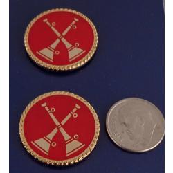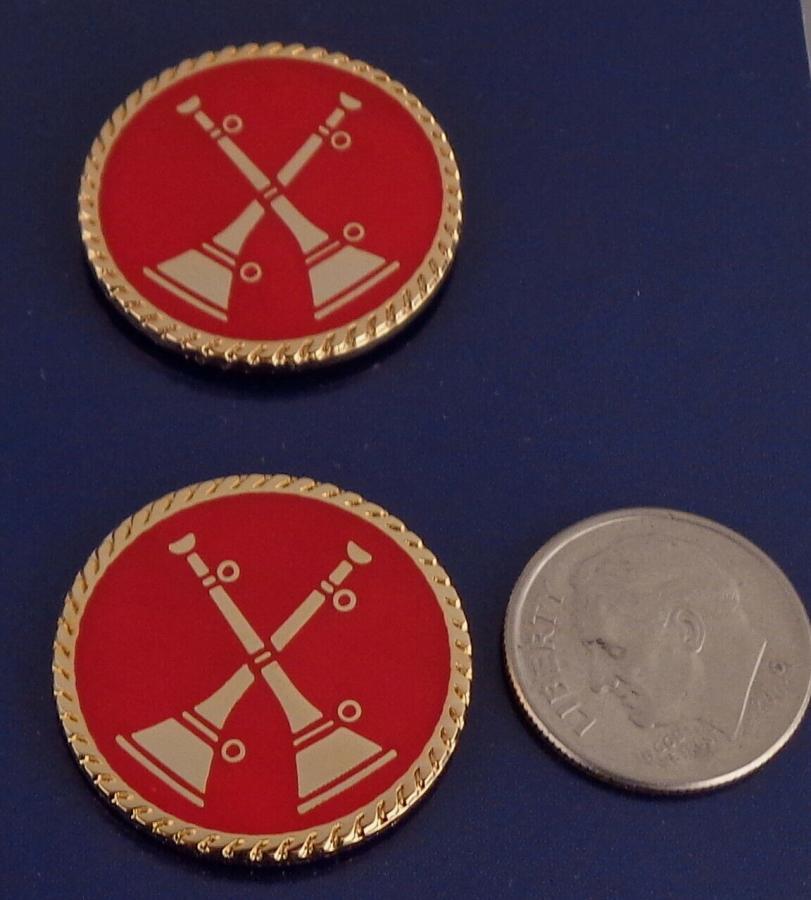 2 Bugles CROSSED Gold on Red Fire CAPT Captain Flat Discs Collar Pins 15/16