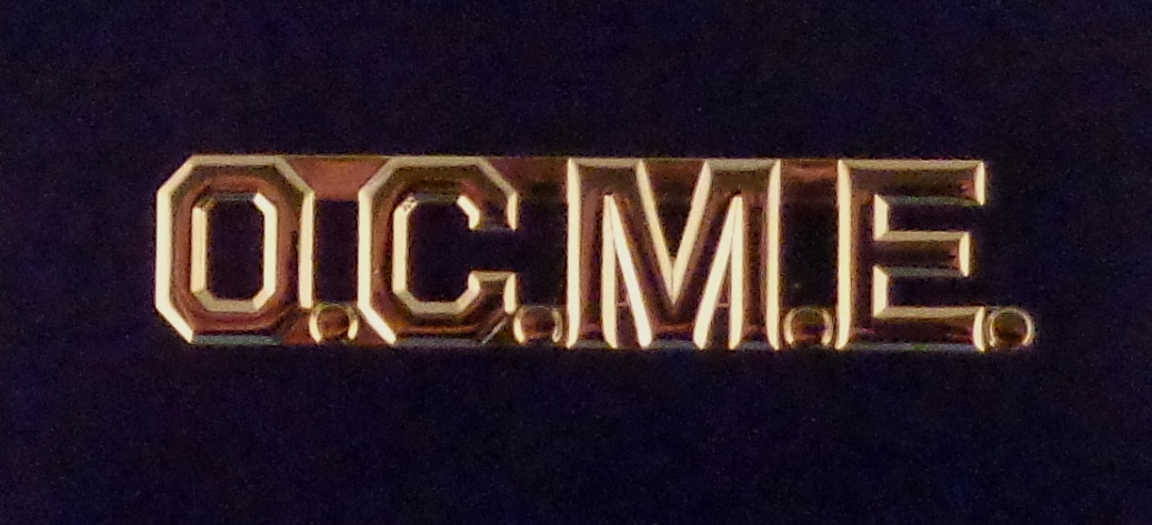 O.C.M.E. Office of Chief Medical Examiner 3/8" polished Gold lapel pin
